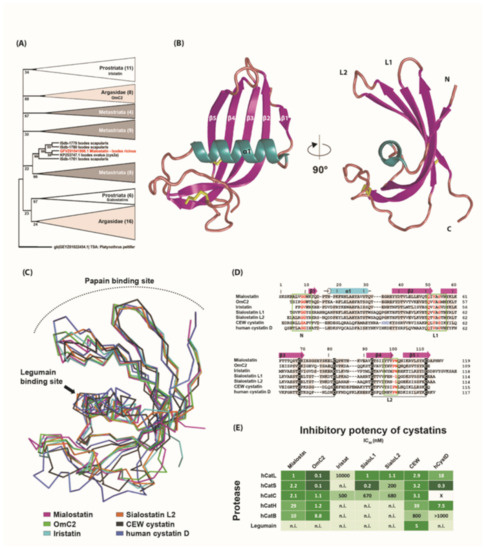 - Kordiš, D.; Turk, V. Phylogenomic analysis of the cystatin superfamily in eukaryotes and prokaryotes. BMC Evol. Biol. 2009, 9, 266. [Google Scholar] [CrossRef]