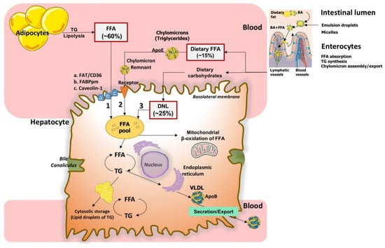Physiologically, the liver accumulates FFA from three different sources: uptake of circulating FFA, de novo synthesis of FFA, and uptake of dietary FFA (Figure 1) [17].
