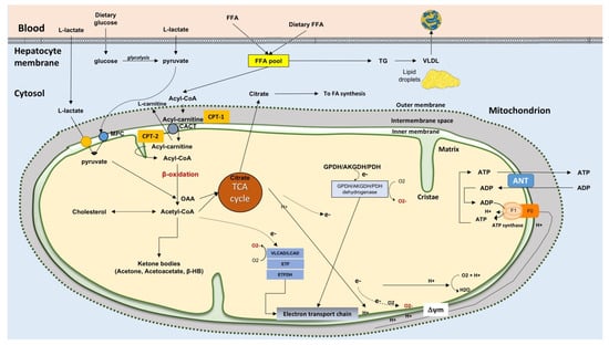 Mitochondrial adaptation and oxidative stress in NAFLD. Mitochondrial oxidative metabolism and hepatocyte energy homeostasis depend on FFA β-oxidation, the tricarboxylic acid cycle (TCA), electron flow along the electron transport chain, electrochemical proton gradient generation, and ATP synthesis. When β-oxidation is impaired (e.g., in liver steatosis), lipotoxic lipids accumulate. Moreover, dysfunction of the electron transfer chain can result in ROS generation. ROS are generated from glycerol 3-phosphate dehydrogenase (GPDH), pyruvate dehydrogenase (PDH), and α-ketoglutarate dehydrogenase (AKGDH) as minor contributors. In starvation, ketone bodies are produced due to the absence of oxaloacetate used in gluconeogenesis. Dietary carbohydrates and dietary FFA are the two major sources contributing to the FFA pool in the hepatocyte. When fatty acid synthesis occurs, glucose essentially from dietary sources is converted to pyruvate during glycolysis. Pyruvate can enter the mitochondrion via the mitochondrial pyruvate carrier (MPC) as well as can be synthesized from L-lactate after transport of L-Lactate in the matrix, via its own carrier, and oxidation via the mitochondrial L-lactate dehydrogenase [35,36]. In the matrix, pyruvate can provide Acetyl-CoA via the pyruvate dehydrogenase complex and oxaloacetate (OAA) via the pyruvate carboxylase. Due to citrate synthase, pyruvate and oxaloacetate provide citrate that can be exported to allow for FFA synthesis in the cytoplasm in the de novo lipogenesis (DNL). How citrate can be exported outside mitochondria is described below. Abbreviations: ACC, acetyl-CoA carboxylase (ACC); ANT, adenine nucleotide translocator; CACT, carnitine-Acylcarnitine Transferase; CPT-1, carnitine palmitoyl-transferase-1; CPT-2, carnitine palmitoyl-transferase-2; DNL, de novo lipogenesis; electron transfer flavoprotein (ETF); ETFDH, ETF dehydrogenase; FFA, free fatty acids; β-HB, β-hydroxybutyrate; MPC, mitochondrial pyruvate carrier; OAA, oxaloacetate; PEP, phosphoenolpyruvate; TG, triglycerides; VLDL, very-low-density lipoprotein [37].
