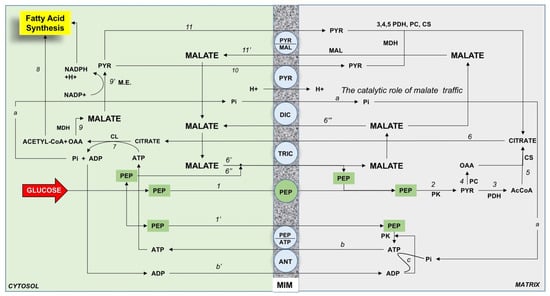 Mitochondria play a major role in fatty acid synthesis. The main point is that citrate, the precursor of the fatty acid synthesis, is synthesized in the mitochondrial matrix and must be exported outside mitochondria where fatty acid synthesis occurs. How this could occur is described in Figure 3. The scheme is based on a variety of experimental findings obtained by using rabbit kidney mitochondria described in [39]; in particular, the role of phosphoenolpyruvate has been considered after the discovery of the mitochondrial pyruvate kinase in pig liver [34] as a major precursor of citrate synthesis in the mitochondria.