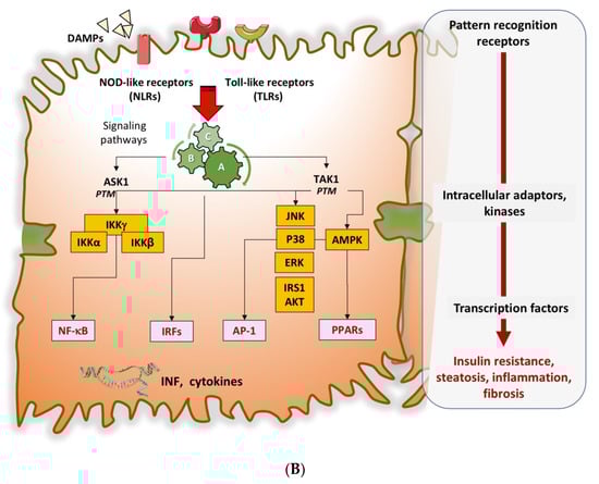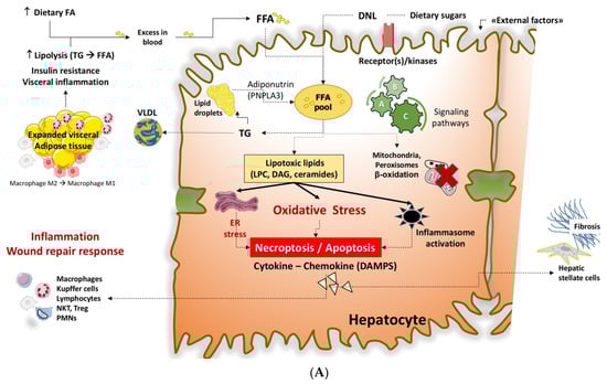 In more detail, the mechanism of lipotoxicity (Figure 4A,B) involves receptor/kinase-mediated interactions and signaling pathways; the ER and other intracellular organelles, including mitochondria and the nucleus, play a significant role [91]. Further consequences are ER stress, inflammatory changes such as metabolic inflammation or meta-inflammation [92], production of ROS, and cell death with DAMPs [93]. The innate immune system becomes part of this metabolic inflammation, with the recruitment of Kupffer cells, dendritic cells, lymphocytes, as well as hepatocytes and endothelial cells [94,95]. With the activation of transcription factors, other events include the release of inflammatory cytokines and chemokines, stimulation of hepatic stellate cells with collagen deposition, and further aggravation of the insulin resistance status. All these steps are harmful features in the progression of NASH [96].