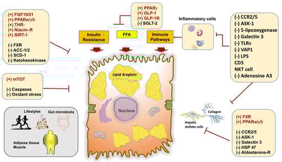 Potential therapeutic targets for NASH, as available from phase 2 and 3 clinical trials. Sites of action include liver pathways involved in lipid and glucose homeostasis, oxidative stress, mitochondrial function, inflammatory signals, intracellular targets related to stellate cell activation and fibrogenesis. Some targets (e.g., FXR agonists, C-C motif chemokine receptor [CCR] 2 and 5 (CCR2/5) antagonist) display more than one action site. Additional extrahepatic interventions appear in the left lower box. Symbols point to agonists (+) or antagonist (-) effect. Abbreviations: DGAT, diacylglycerol O-acyltransferase; SCD, steroyl CoA-desaturase; THR, thyroid hormone receptor; SIRT, sirtuin; GLP, glucagon-like peptide; SGLT, sodium-glucose cotransporter; VAP, vascular adhesion protein; LPS, lipopolysaccharide; PPARα/δ/γ, peroxisome proliferator-activated receptors PPARα, PPARδ and PPARγ [66].