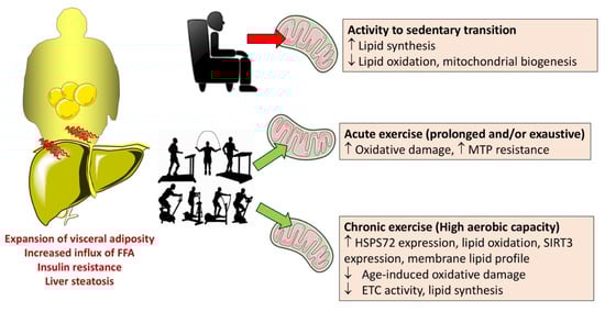 - Ascensao, A.; Martins, M.J.; Santos-Alves, E.; Goncalves, I.O.; Portincasa, P.; Oliveira, P.J.; Magalhaes, J. Modulation of hepatic redox status and mitochondrial metabolism by exercise: Therapeutic strategy for liver diseases. Mitochondrion 2013, 13, 862–870. [Google Scholar] [CrossRef] [PubMed]