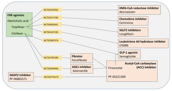 Ongoing clinical studies in NAFLD patients. Current and experimental agents are listed. NCT refers to ClinicalTrials.gov identifier number, as available at https://clinicaltrials.gov/ct2/home, accessed on 19 May 2021).