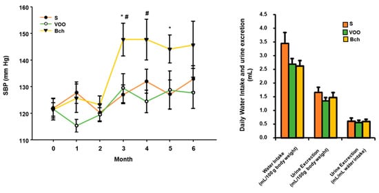 Means values ± standard errors of systolic blood pressure (SBP) expressed as mmHg, water intake and urine excretion, expressed as mL/100 g BW and the relationship between urine excretion and water intake. S: standard diet, VOO: virgin olive oil diet, Bch: butter plus cholesterol diet. * indicates significant differences between VOO or Bch vs. S, * p < 0.05. # indicates significant differences between VOO and Bch, # p < 0.05.
