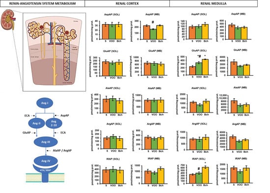 Anatomical representation of the renal parenchyma and partial scheme of the classic axis of the renin–angiotensin system, displaying the metabolic steps in which angiotensinase activities are involved. Mean values ± standard errors of aspartyl-, glutamyl-, alanyl-, arginyl- and insulin-regulated aminopeptidase activity (AspAP, GluAP, AlaAP, ArgAP, IRAP) in soluble (SOL) and membrane-bound (MB) fractions of renal cortex and medulla. Values are expressed as pmol/min/mg prot. * indicates significant differences between VOO or Bch vs. S, * p < 0.05. # indicates significant differences between VOO and Bch, # p < 0.05.