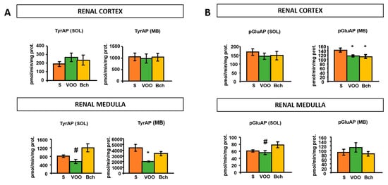 Mean values ± standard errors of (A) tyrosyl aminopeptidase activity (TyrAP) and (B) pyroglutamyl aminopeptidase activity (pGluAP) in soluble (SOL) and membrane-bound (MB) fractions of renal cortex and medulla, expressed as pmol/min/mg prot. * indicates significant differences between VOO or Bch vs. S, * p < 0.05. # indicates significant differences between VOO and Bch, # p < 0.05.