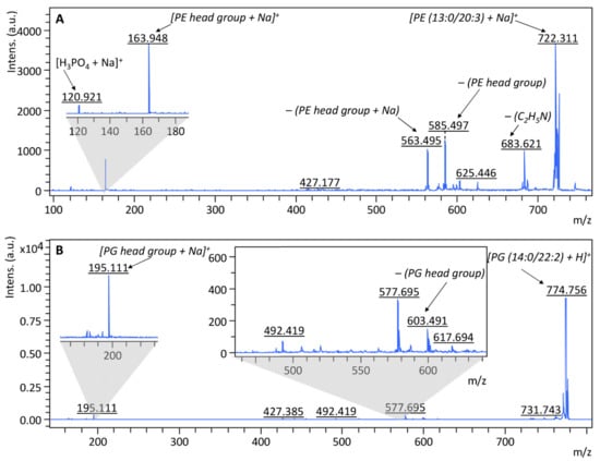 - Gidden, J.; Denson, J.; Liyanage, R.; Ivey, D.M.; Lay, J.O. Lipid compositions in Escherichia coli and Bacillus subtilis during growth as determined by MALDI-TOF and TOF/TOF mass spectrometry. Int. J. Mass Spectrom. 2009, 283, 178–184. [Google Scholar] [CrossRef]