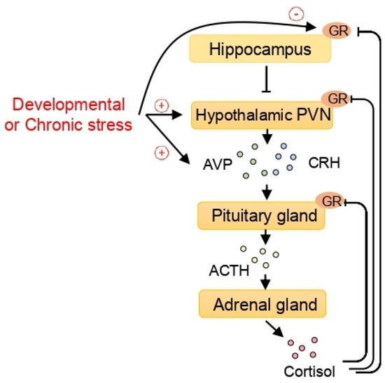 From the epigenetic perspective, stress is considered to be an important factor in the etiology of stress-related disorders such as depression and anxiety [76]. When exposed to social and physical stressors, the paraventricular nucleus (PVN) of the hypothalamus is stimulated to secrete both corticotrophin-releasing hormone (CRH) and arginine vasopressin (AVP) which stimulate the release of adrenocorticotropic hormone (ACTH) in the pituitary gland. Consequently, mainly cortisol in humans and corticosterone in rodents are produced in the adrenal cortex and released into the bloodstream, exerting their effects through glucocorticoid receptors (GRs) in each tissue. The activation of GRs in the PVN of the hypothalamus and pituitary corticotroph cells inhibits the hypothalamic release of CRH and AVP and contributes to the negative feedback regulation of the HPA axis [77,78,79,80]. Additionally, the hippocampus can contribute to feedback regulation of the HPA axis through GR signaling [81]. This regulation is important in handling challenging situations and maintaining homeostasis (Figure 1).