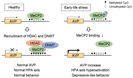 Epigenetic programming of arginine vasopressin (AVP). In normal conditions, AVP expression is repressed by methyl CpG binding protein 2 (MeCP2), DNA methyltransferase (DNMT), and histone deacetylase (HDAC) complex. However, early-life stress induces MeCP2 phosphorylation, inhibiting the recruitment of DNMT and HDAC consequently leading to hypomethylation at the AVP enhancer. As a result, increased AVP levels contribute to hyperactivation of the HPA axis and depressive-like behaviors.