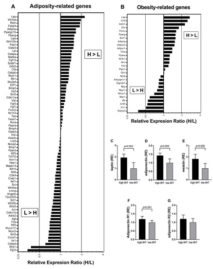 - Ortega, F.J.; Mayas, D.; Moreno-Navarrete, J.M.; Catalán, V.; Gómez-Ambrosi, J.; Esteve, E.; Rodriguez-Hermosa, J.I.; Ruiz, B.; Ricart, W.; Peral, B.; et al. The gene expression of the main lipogenic enzymes is downregulated in visceral adipose tissue of obese subjects. Obesity 2010, 18, 13–20. [Google Scholar] [CrossRef] [PubMed]
