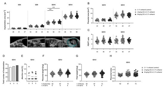 Figure 1C) at GD10 and 12 did not reveal significant differences among the groups. After sacrificing the pregnant dams at GD12, we did not observe changes in the total number of implantations or in the abortion rates between DG treatments and controls (