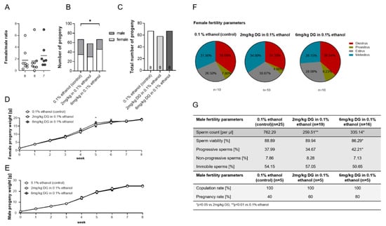 After we focused our analyses on pregnancy itself, we were interested in figuring out whether progeny of DG-exposed dams would show any modifications in their ability to gain weight during the first 8 weeks of life and would be as fertile as the progeny of vehicle-exposed dams. Remarkably, we observed a shift in the female-to-male progeny ratio in favor of the females after 6 mg/kg DG (
