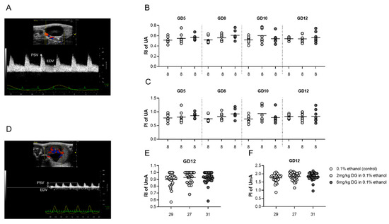 Figure 5A,D display the location of the UA and UmA in situ, respectively, as well as a representative Doppler flow diagram. In line with our previous observations in the dams, DG did not affect the maternal-fetal circulation in subsequent pregnancies of the female progeny.