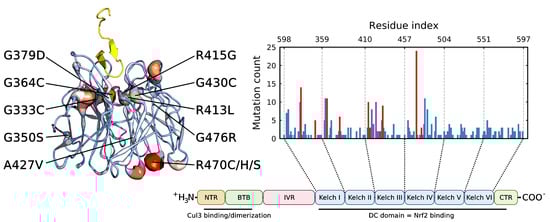 - Khan, H.; Killoran, R.C.; Brickenden, A.; Fan, J.; Yang, D.; Choy, W.Y. Molecular Effects of Cancer-Associated Somatic Mutations on the Structural and Target Recognition Properties of Keap1. Biochem. J. 2015, 467, 141–151. [Google Scholar] [CrossRef]