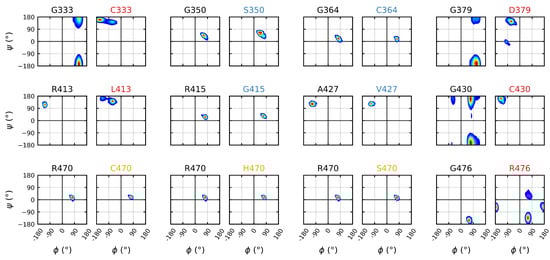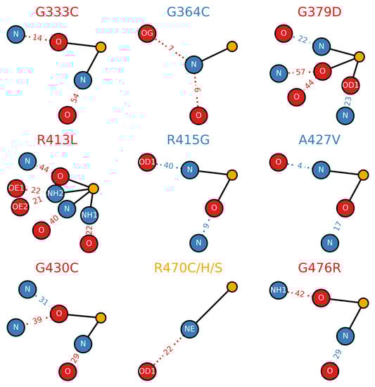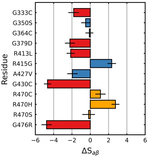 For all but one of the nine mutations, A427V, the observed dynamic behavior is distinctly either destabilizing (G333C, G379D, G430C, R413L and G476R) or neutral/stabilizing (G350S, G364C, R415G, A427V and R470C/H/S), and agrees with published findings (stabilizing: G350S, G364C, R415G and R470C; destabilizing: G333C, G379D, G430C, R413L and G476R) [,,]. A427V showed decreases in S; however, we observed no significant shift in the backbone dihedrals under mutation. Furthermore, favorable increases in the hydrogen bonding, and only a limited increase in the RMSD, all suggest this mutant does not have a significant effect on stability; however, given the S, we classify it as inconclusive.