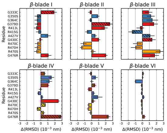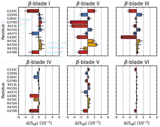 Mutagenic effect on the blade-wise S of Kelch. The average change in S (Equation (1)) (per residue), relative to the wild type was calculated and plotted along with the standard deviation for each -blade. The colors denote the documented effect of the given mutation [,,]: red (destabilizing), blue (neutral/stabilizing) and orange (unknown or neutral/stabilizing). Hatched bars indicate that the mutation is within that particular blade. Sampling was performed over the final 5 s.