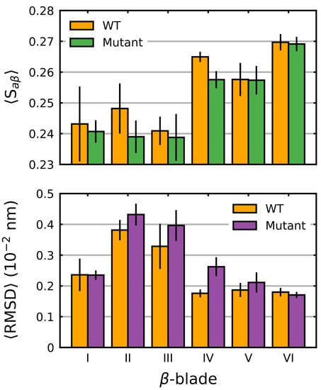 Average blade-wise S and RMSD in the Kelch domain. The average S (Equation (1)) (per residue) and RMSD (per residue) was calculated and plotted along with the standard deviation for each -blade in the wild-type Kelch. The average over all the mutants (both stabilizing and destabilizing) was also calculated and plotted. Sampling was performed over the final 5 s.