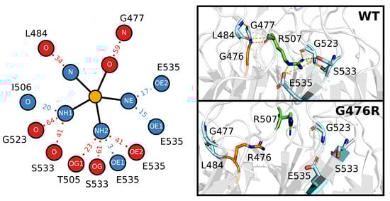Not all the mutations directly affected the hydrogen bonding network of Kelch. The notable increases in the RMSD, and decreases in S, as well as the unique backbone dihedral pattern of G476R (Figure 7), led us to take a closer look at this buried amino acid. We identified a nearby arginine (Figure 9), R507, that forms hydrogen bonds with G477, L484, G523 and S533, all of which were significantly disrupted or completely lost as a result of the G476R mutation. Exact lifetimes and hydrogen bonding partners are provided in Table S2. Analysis of the residue-wise contact map revealed similar trends to those observed in the hydrogen bonding (Figure S5).