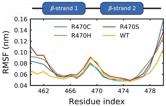 Our work provides additional insight into the structural dynamics of mutants that could not be analyzed experimentally, painting a more complete picture of their mutagenic effects []. These findings also appear to point to a preferential targeting of protein stability in cancer mutants, which to our knowledge is being reported for the first time. In addition, our analysis points to S (Equation (1)) being a superior metric compared to RMSD for characterizing the effects of the mutations on the Kelch propeller. While this cannot be employed for all systems, when applicable, the use of S or the associated parallel -strand (S) and -helical (S) order parameters [] would provide insights beyond the standard RMSD, RMSF and radius of gyration metrics. Furthermore, our results reveal that the R470C ANCHOR mutant induces only minor structural changes in the binding site of Kelch relative to the wild type, suggesting that a direct allosteric effect of the mutant may not fully explain its potential mode of action and frequent occurrence in the cancer database.