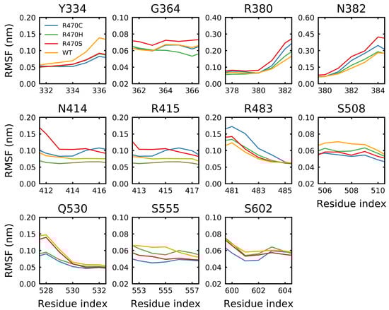 The root mean square fluctuation (RMSF) was calculated over the final s of the R470C, R470H, R470S and wild-type trajectories. The RMSF is a measure of the average geometric deviation of a residue from its initial position. An RMSF near zero indicates that a residue spends most of the time constrained to its initial position. Unstructured loop and coil regions tend to have higher RMSF values, while structured helical and -sheet regions tend to have lower values. The RMSF at and around the R470C, R470H and R470S mutation sites resulted in minimal changes from the wild type; however, the fluctuations at R470C and R470H were the lowest of the mutations considered (Figure 10). Notably, all of the R470 mutations resulted in significantly higher fluctuations at residues flanking the mutation site (i.e., <463 and >477) compared to the wild type. The ANCHOR mutants are believed to increase binding affinity of KEAP1 for NRF2 via backbone perturbations that alter the binding site []. Residues identified by PISA (Proteins, Interfaces, Structures and Assemblies) [] to be involved in hydrogen-bonding with the Neh2 domain of NRF2 (Y334, G364, R380, N382, N414, R415, R483, S508, Q530, S555 and S602) were examined. While only minor effects due to the mutations were observed, the R470H and R470C mutations tended to show the lowest fluctuations at binding site residues (Figure 11). For the Y334, S508 and S555 residues, reduced fluctuations were observed for all the mutations compared to the wild type. Notably, the R470C mutation resulted in the highest fluctuation at R483, which is the closest binding site residue in the protein sequence.
