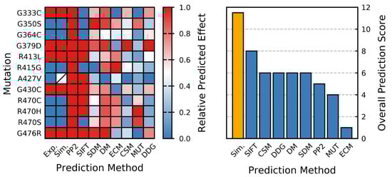 Performance of methods for predicting protein stability. Relative predicted effect (destabilizing: red, stabilizing: blue) is based on the normalized value for each method (most destabilizing mutation predicted by a given method is assigned a score of 1, while the most stabilizing is assigned a score of 0). In some cases, the assignment is strictly binary. Overall predictive score is based on the number of “correct” predictions (number of predicted mutation effects that agree with previous experimental findings). Abbreviations are used for some of the in silico methods, and these are indicated as follows: Exp.: In vitro effect [,,], Sim.: predicted effect from the MD analysis performed herein, PP2: PolyPhen-2 [], SIFT [], SDM [], DM: DynaMut [], ECM: EnCoM [], CSM: mCSM [], MUT: I-Mutant 3.0 [,] and DDG: DeepDDG [].