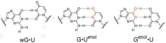 The complementarity of purine and pyrimidine nucleobases (i.e., G-C and A-T) is essential to form the double stranded DNA helix as proposed by Watson–Crick []. However, occasional occurrence of the noncanonical mispairing of nucleobases (e.g., a base paired to one of its less likely tautomeric forms []) leads to spontaneous mutations. Nucleic acid bases due to the presence of their carbonyl and amino functional groups can exist in multiple tautomeric forms, i.e., keto–enol and amino–imino [,]. The “major” tautomers keto- and amino-forms are predominant under physiological conditions whereas, “minor” tautomers imino- and enol forms are rare. One such example is the guanine•uracil (G•U) mismatch, which typically forms the wobble structure with the two hydrogen bonds instead of three in a complementary WC G•C match.
