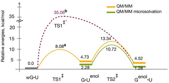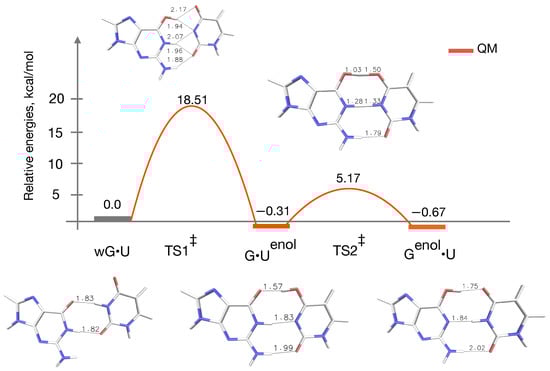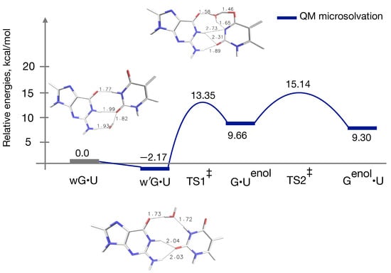 Surprisingly, the relative energy of the is lowered to 13.3 kcal/mol. In addition to that, the w’G•U structure, which turned out to be the most stable intermediate along the reaction energy profile, was located. This w’G•U structure has a relative energy of about −2.0 kcal/mol. Various wobble mismatches were reported earlier in order to predict novel pathways to connect WC-like G•T and G•T DNA base mispairs []; however, no water was included into the system. Interestingly, now wG•U → G•U becomes endoergic as was reported in case of wG•T → G•T tautomerization []. As a result of that, the relative energy of the TS2 increases to 15 kcal/mol, yet the G•U → G•U transition is slightly favorable as was found earlier from QM reaction energy profile without the microsolvation. A point to be noted: In case of the QM-modeling of the G•U → G•U transition, as the water molecule is not directly taking part, while calculating the relative energies of G•U and G•U with respect to the wG•U structure, the energy of one water molecule calculated at the same QM-level of the theoretical methods (i.e., B3LYP/6-311++G(d,p)) was added with the respective intermediates and/or TS. The TS2 shows higher activation barrier with water compared to that of without the water (see Figure 5). However, the overall effects of the inclusion of the microsolvent environment in the QM-gas phase model cannot be overlooked.