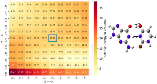 Reaction profile of the constrained TS search along the reaction coordinate X and Y highlighted in the balls and sticks representation of the G•U base pair for locating TS2 (6-31+G* basis sets used). Here, the QM-region consists of the G•U base pair along with two water molecules. The highlighted point was used for the TS optimization. Relative energies (kcal/mol) are calculated with respect to the wG•U base pair.