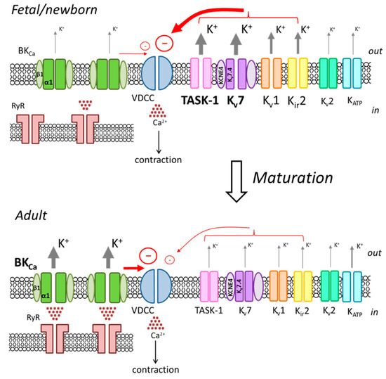 Taken together, the data described above demonstrate that the pattern of potassium channel expression and function in arterial smooth muscle changes dramatically while the organism matures (Figure 1, Table 1). Importantly, such alterations do not seem to be dependent on the embryological origin of the particular vascular bed, since similar patterns of changes were observed in the proximal part of the aorta and smaller arteries [88]. BKCa channels acquire an important role in the regulation of vascular tone with maturation, but their role in developing arteries is limited. BKCa channel activation by calcium sparks is weak in the newborn organism due to an unfinished co-localization process with RyRs of the sarcoplasmic reticulum and a low calcium spark frequency. Less calcium-dependent potassium channel types (Kv1, Kv7, TASK-1 and Kir2) play the main role in counteracting vasocontraction at early postnatal life. Indeed, contraction of the arterial smooth muscle depends much more on calcium in the adult age than in the early postnatal period. Therefore, while the vascular remodeling in postnatal development proceeds (including the formation of BKCa/RyRs clusters), a switch of the potassium channels from less to more calcium-dependent ones occurs. Conditions affecting arterial smooth muscle potassium channels expressed at high levels during the early postnatal period, especially Kv7 and TASK-1 channels, may disturb the developmental switch of potassium channel contribution to arterial tone regulation. This may possibly lead to disturbances in potassium channel function in childhood. The latter in its turn may cause the development of cardiovascular disorders, including hypertension [3,89,90,91,92,93,94], the occurrence of which is steadily increasing in childhood [95].