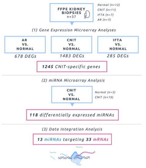 To date, the development of CNIT biomarkers has been hampered by an incomplete understanding of its underlying molecular mechanisms. Current reliance on late and insensitive markers such as serum creatinine precludes the identification of CNIT prior to the onset of irreversible damage. The lack of surrogate markers highlights a knowledge gap regarding the underlying molecular mechanisms of CNIT. Therefore, we sought to characterize a molecular phenotype of CNIT using an integrative approach. We hypothesized that the interplay of differentially expressed miRNAs and target mRNAs would provide the basis for a unique molecular signature for accurate pediatric CNIT diagnosis. MiRNAs, which are non-coding, endogenous single-stranded RNA that post-transcriptionally repress gene expression, have emerged as a promising class of biomarkers utilized in molecular diagnostics and have garnered interest as potential therapeutic tools [26,27]. With the utilization of miRNA and gene expression tissue profiles, the specific aim of this study is to identify (1) the critical gene pathways associated with CNIT development in pediatric KT recipients and (2) key miRNA–mRNA interactions using data integration between these two molecular layers of regulation.