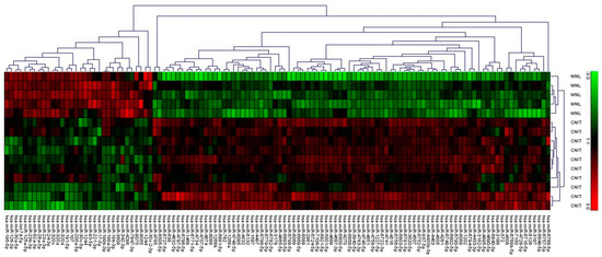 Hierarchical clustering analysis showing differentially expressed microRNAs between Normal (WNL) and CNIT allografts. MiRNA signatures in tissue samples differentiate between histological conditions.