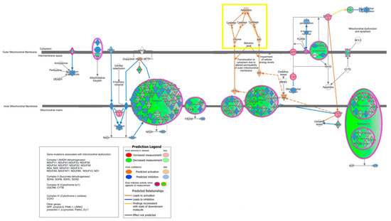 Molecule activity predictor (MAP) pathway analysis demonstrating mitochondrial dysfunction (p = 2.90 × 10−32) as one of the top pathways affected in CNIT samples. Genes associated with complexes I-V of the electron transport chain (green) were significantly downregulated. Caspases 3, 8, 9, and Cytochrome C (yellow box) are predicted to be activated, demonstrating the in-silico activation of apoptosis.