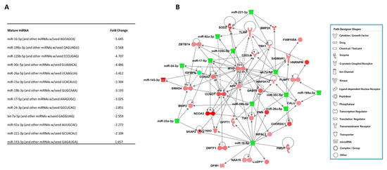 (A) List of 13 differentially expressed miRNAs in CNIT samples. (B) Integrated network of 13 miRNAs and their downstream up- (red) and down- (green) regulated genes.