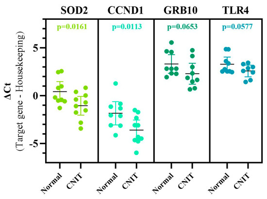 QPCR validation of four candidate genes using CNIT and Normal samples. Plotted with mean values and 95% confidence intervals. Gene expression normalized using the GAPDH housekeeping gene. A decrease in ΔCt represents an increase in gene expression. SOD2 and CCND1 were significantly upregulated, while GRB10 and TLR4 showed a trend in significance.