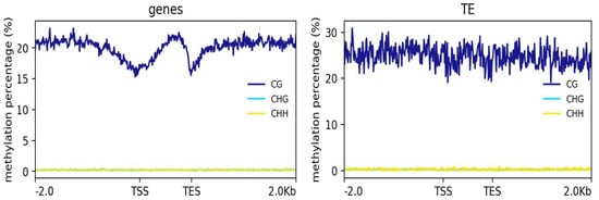 Next, we examined the methylation levels across the gene regions 2-kb upstream and downstream of the transcription start and end sites and TEs in the hybrid cells. The genes and TEs displayed different methylation patterns (Figure 2). In the gene regions, CG methylation was lowest near the transcription start site (TSS) and was gradually increased across the gene body with a sharp decrease at the transcription end site (TES). However, the TEs showed similar methylation levels across their gene bodies, with 2-kb upstream and downstream sequences. CHG and CHH methylation across the genes and TEs were both close to zero (Figure 2).