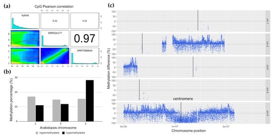 To assess the similarities in Arabidopsis DNA methylation between the wild-type leaf tissue and the hybrid line, two wild-type Arabidopsis leaf tissue WGBS datasets (SRR7596644 and SRR534177) were downloaded as the controls from SRA (https://www.ncbi.nlm.nih.gov/sra, accessed on 19 May 2021), and Pearson pairwise correlations were calculated using methylKit [31]. The correlation coefficients between both wild-type controls were high at 0.97 but low with respect to the hybrid cell line (0.21 and 0.19), indicating that the methylation of the Arabidopsis regions in the hybrid cells was very different from that of wild-type Arabidopsis (Figure 3a). SRR7586644 was used as the wild-type control for the following experiments based on its paired-end sequencing format, which is more similar to the hybrid cell data and has a slightly better sequence quality.
