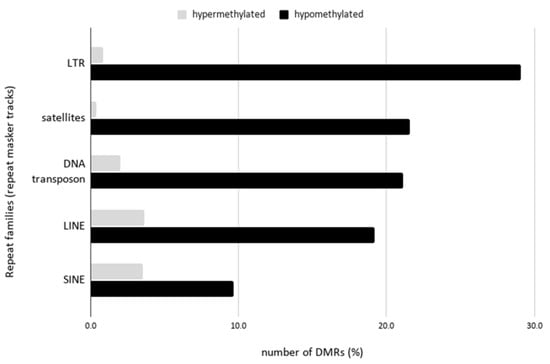 To determine whether the Arabidopsis DNA repeats were preferentially methylated in the human genome background, the differentially methylated regions were examined against the overlapping regions based on the RepeatMasker tracks in the ReMap database [32]. Interestingly, all the Arabidopsis repeat families (LINE, LTR, DNA transposons, satellites) showed hypomethylation in the hybrid cell line (Figure 4). The most distinct pattern was observed in the satellite repeat families, with the hypomethylation being 60 times higher than that in the hypermethylated regions. Within the satellite family, the COLAR12 class, which is the consensus sequence of 178 bp of Arabidopsis satellites restricted to pericentromeric heterochromatin [33], showed the highest hypomethylation (Table S2). This was followed by LTR regions with a 35-fold difference. The highest frequency of LTR elements in the hypomethylated regions was in the Athila LTR family (Table S2), which is a centromere-associated LTR element.