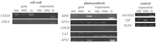 To investigate the expression of plant genes in the hybrid cell line, ten Arabidopsis genes were selected to test for their expression based on biologically interesting functions, such as photosynthesis and cell wall biosynthesis (Table 2). The results of the RT-PCR analysis partially agreed with the previous microarray data [25], with six (NPY4, CA2, LHCB4.3, AtNADH, GAMMA-TIP, and PLP6) of the 10 genes expressed in both the 60- and 300-day-old hybrid cell lines (Table 2 and Figure 6). The presence or absence of gene expression was consistent between the 60- and 300-day-old hybrid cells (Table 2 and Figure 6). The HPR gene, located on Arabidopsis chromosome 1, was eliminated in the 300-day-old hybrid cells and was not expressed in the 60-day-old hybrid cells. Three highly expressed genes in the microarray analysis (AtNADH, GAMMA-TIP, and PLP6) that were validated previously using RT-PCR in the 60-day-old hybrid cells [25] were expressed in both the 60- and 300-day-old hybrid cells, suggesting that they might remain in the expression during the 240-day culture (Figure 6). The expression of two cell wall-related genes, CESA4 and GSL8, was also investigated in the hybrid cell lines. We found that, although both genes were present, they were not expressed in the 60- and 300-day-old hybrid cells.