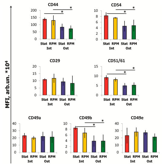 - Ratushny, A.; Yakubets, D.; Zhivodernikov, I.; Buravkova, L. Adhesion molecules of multipotent mesenchymal stromal cells obtained from adipose tissue during simulation of the effects of microgravity. Aerosp. Environ. Med. 2017, 51, 38–43. [Google Scholar] [CrossRef]