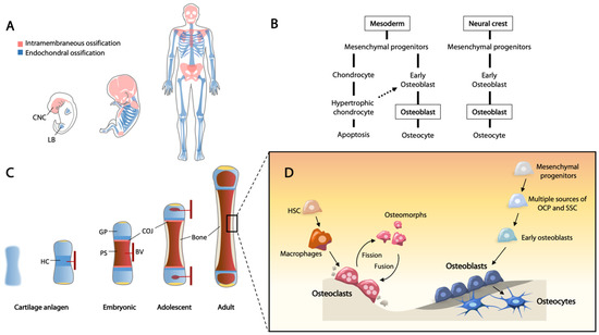 Bones originate from three identifiable lineages in early embryogenesis. The axial skeleton, including the spine and rib cage, are derived from the somites; craniofacial bones are generated from the neural crest and paraxial mesoderm; and the appendicular skeleton is derived from the lateral plate mesoderm [1,2,3]. Skeletal development begins with migration of mesenchymal cells to the sites of future bones, and skeletal elements are then formed via either intramembranous ossification or endochondral ossification, both of which begin with the mesenchymal cell condensation [4] (Figure 1A).