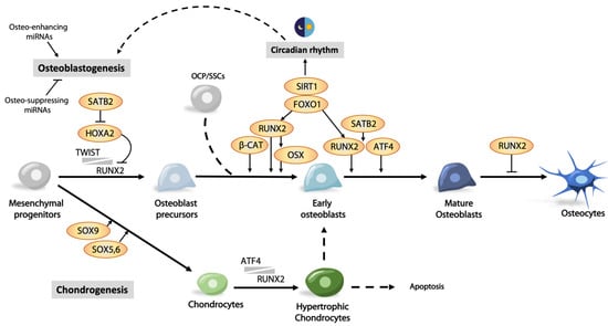 Transcriptional regulation of osteoblast differentiation. SOX9 and RUNX2 are major fate determinants of mesenchymal progenitors to chondrogenesis and osteoblastogenesis, respectively. Cells can “detour” to chondrogenesis or commit to an osteoblast lineage. RUNX2 is the master transcription factor that regulates multiple steps in osteoblast commitment and differentiation. Its transcriptional activity is controlled at multiple levels such as transcriptional co-factors, inhibitors, osteo-enhancing and -suppressing miRNAs, and environmental cues such as light–dark cycle.