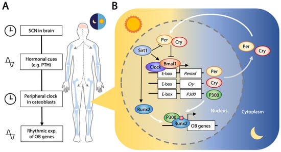 Most living organisms exhibit time-dependent physiological and behavioral changes across the circadian rhythm of the daily day/night cycle. Sleeping, metabolism, the immune system, and tissue repairs are controlled by this biological clock that oscillates with the expression of a set of genes in a repeating 24 h cycle [150,151]. The central clock is located in the suprachiasmatic nucleus (SCN) of the hypothalamus, receiving and conveying light/dark cycle information with periodic signals. Transferal of neural or hormonal (such as PTH and glucocorticoids) signals is then relayed to circadian oscillators located in the peripheral tissues [152,153] (Figure 3A).