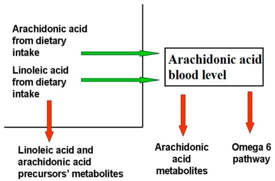 The AA state depends on the endogenous synthesis from the essential precursor LA, undergoing desaturation and elongation, and the direct dietary intake [88]. Since LA to AA conversion efficiency is low in humans, AA intake through the diet appears to be significantly more effective in raising its circulating levels.