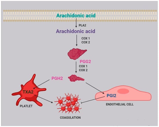 Role of arachidonic acid in the coagulation process. Arachidonic acid is released from cell membranes by phospholipase A2 (PLA2) and subsequently metabolized by COX1 and COX2 to obtain prostaglandin G2 (PGG2) and H2 (PGH2).