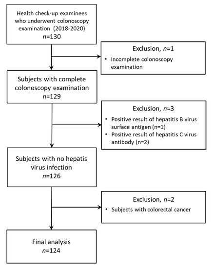- Huang, K.W.; Leu, H.B.; Wang, Y.J.; Luo, J.C.; Lin, H.C.; Lee, F.Y.; Chan, W.L.; Lin, J.K.; Chang, F.Y. Patients with nonalcoholic fatty liver disease have higher risk of colorectal adenoma after negative baseline colonoscopy. Colorectal Dis. 2013, 15, 830–835. [Google Scholar] [CrossRef]
