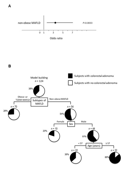 In a decision-tree algorithm, non-obese MAFLD was identified as the most important classifier for the presence of colorectal adenoma. Colorectal adenoma was observed in 54% of subjects with MAFLD, while colorectal adenoma was observed in 26% of subjects with obese- or T2DM-MAFLD (Figure 3B). The second and third classifiers were sex and age, respectively. Colorectal adenoma was observed in 86% of subjects with non-obese MAFLD, men, and ≥57 years old. On the other hand, both obesity and T2DM-MAFLD were not identified as a classifier for the presence of colorectal adenoma.