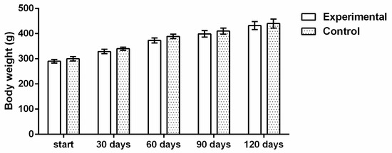 No changes in usual behavior of the rats, as well as changes in skin and hair, food and water consummation, or urinating and defecation, were noticed during daily observation of the rats during the experiment. Mildly and consistently increased body weight was observed through the experiment (Figure 1).