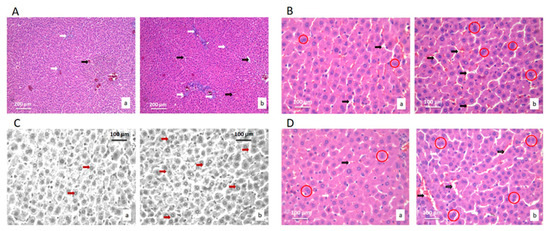 Micrographs of the histological cross-section of the liver of the control group (a) and treated group (b), (H&E). (A) White arrows show connective tissue and black show blood vessels. Magnification 20×. (B) Black arrows show hepatocytes nuclei, and red circles show hepatocytes with two nuclei. Magnification 50×. (C) Red arrows show hepatocytes nuclei. Magnification 50×, digitally processed RGB technique. (D) Black arrows show capillary sinusoids, and red circles show hepatocytes with two nuclei. Magnification 50×.