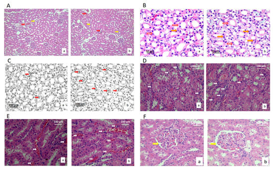 Micrographs of histological cross-sections of the kidney of the control group (a) and treated group (b), (H&E). (A) White arrows show glomeruli, red arrows show blood sinusoids, and yellow arrows show connective tissue. Magnification 20×. (B) Yellow arrows show nuclei, and red arrows show epithelial cells of collecting ducts. Magnification 50×. (C) Red arrows show the epithelial cells of collecting ducts. Magnification 50×; digitally processed RGB technique. (D) White arrows show the connective tissue of collecting ducts. Magnification 50×. (E) White arrows show the blood sinusoids of the collection ducts. Magnification 100×. (F) White arrows show the distance between glomeruli and Bowman’s capsule. Magnification 100×.